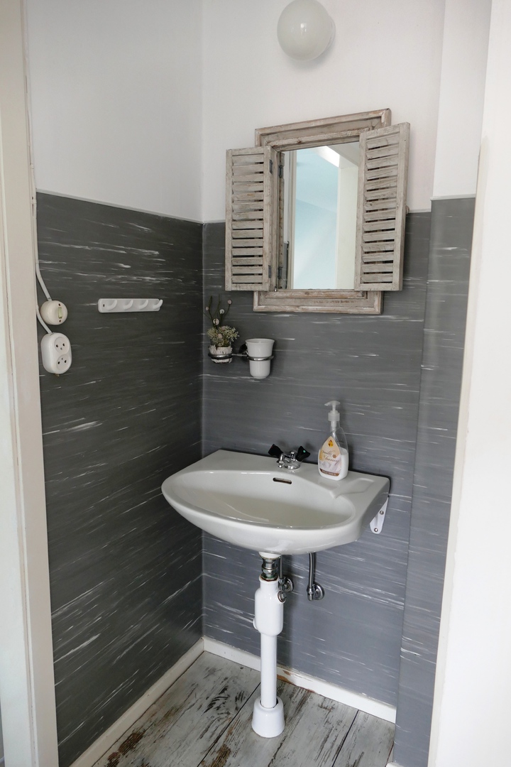 Im EG ein Badezimmer mit Dusche / WC und Waschbecken.